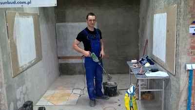 Zadanie na pierwszy rzut oka mogłoby wydawać się dość proste jednak wcale takie nie było. Prostokątne płytki najpierw należało dociąć do formatu kwadratu a następnie cześć z nich przeciąć po przekątnej do formaty trójkątów prostokątnych. Wszystkie cięte krawędzie wyszlifować i dopasować do siebie.